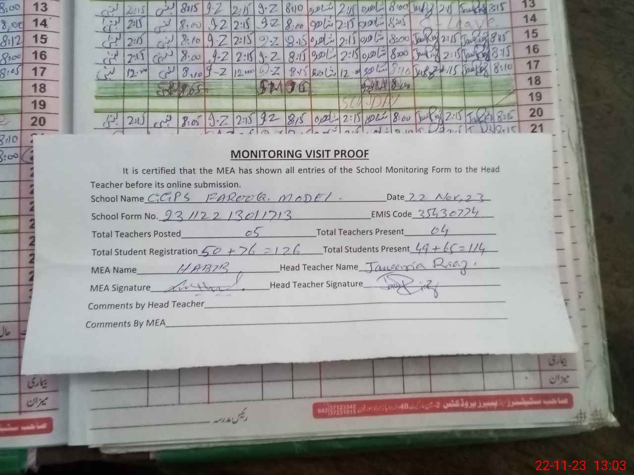 | Attendance Register | Head Teacher | MEA with School | Visit Proof |