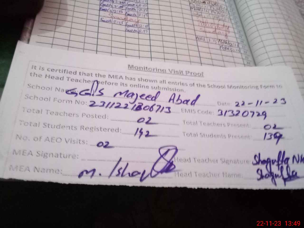 | Attendance Register | Head Teacher | MEA with School | Visit Proof |