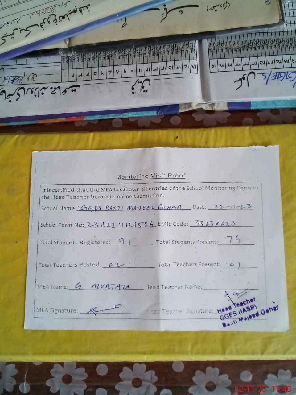 | EMIS Code: 33230623 | Name of School: GGPS BASTI MAJEED GOHAR | |||