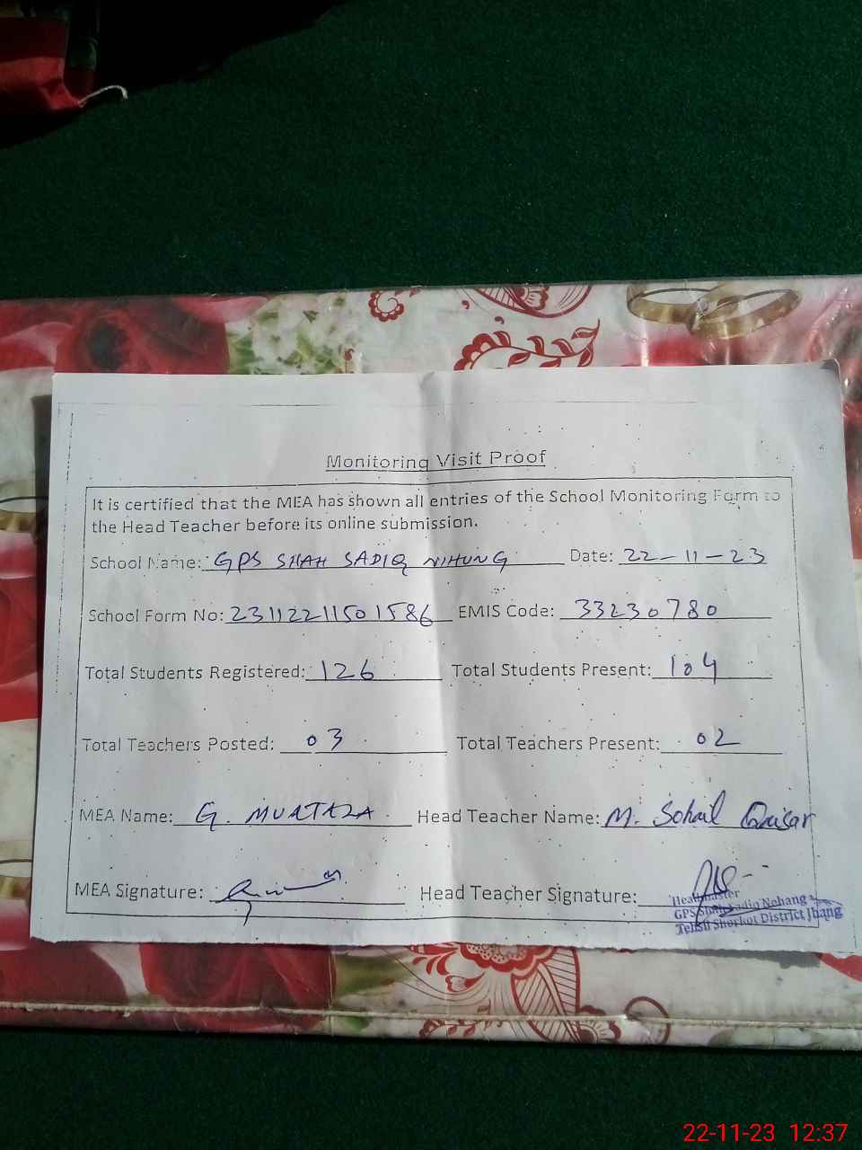 | EMIS Code: 33230780 | Name of School: GPS SHAH SADIQ NIHUNG | |||