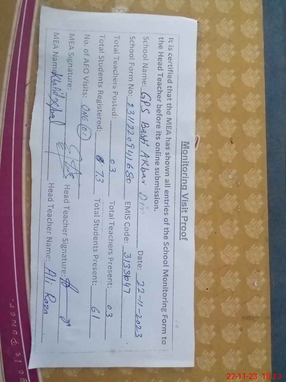 | Attendance Register | Head Teacher | MEA with School | Visit Proof |