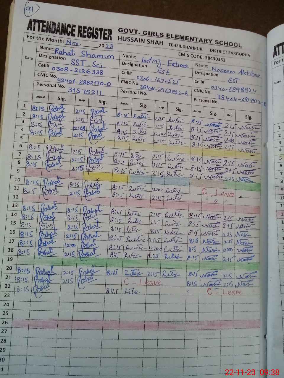 | CNIC | Full Name | Designation | R/C | Absence During Last Calender Month |