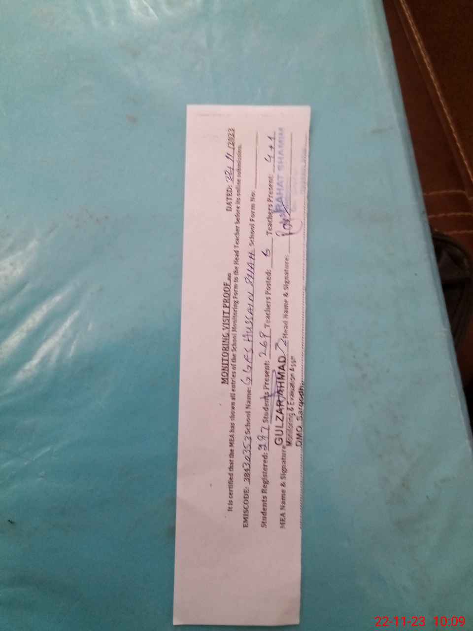 | Attendance Register | Head Teacher | MEA with School | Visit Proof |
