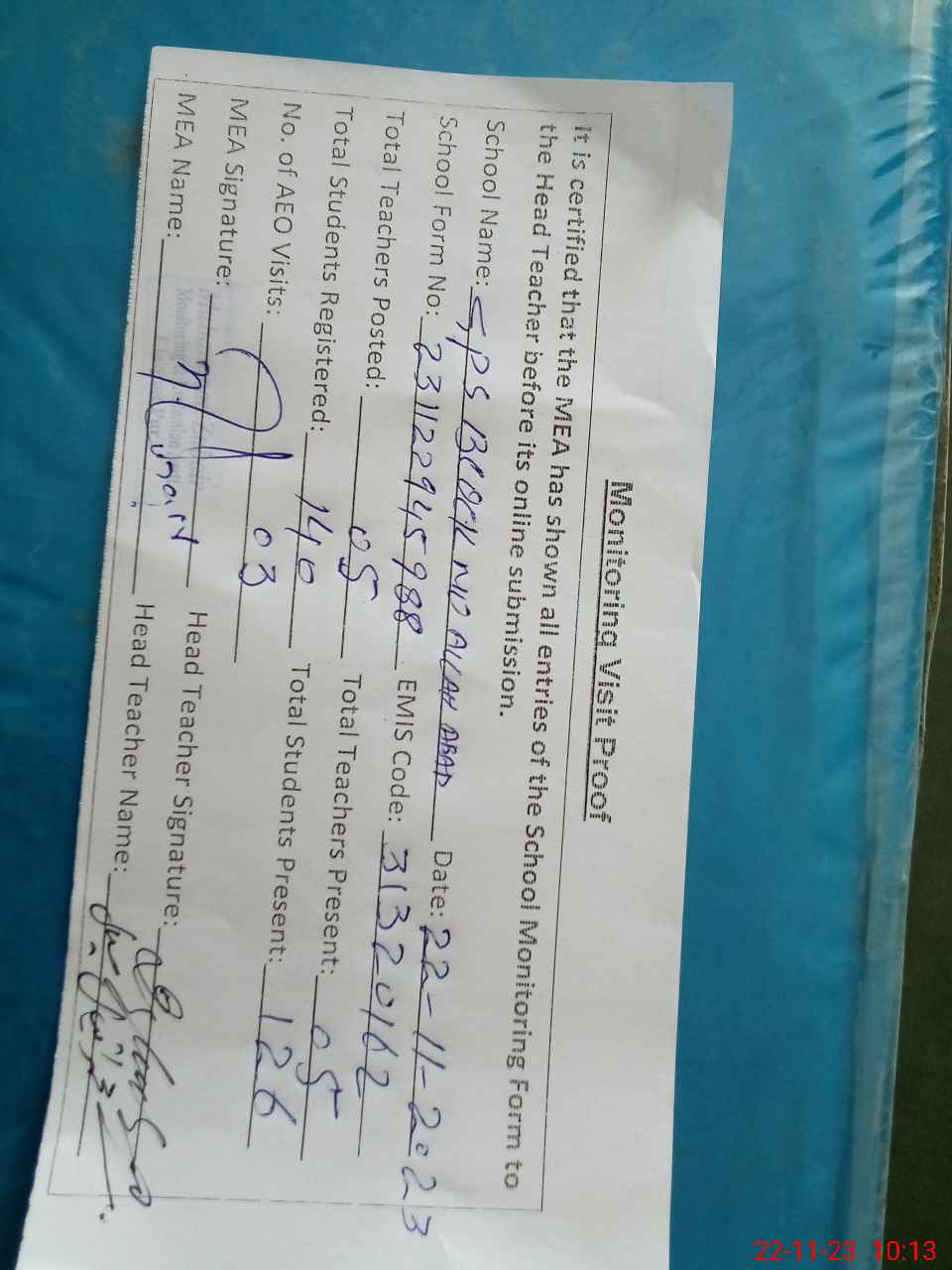 | Attendance Register | Head Teacher | MEA with School | Visit Proof |