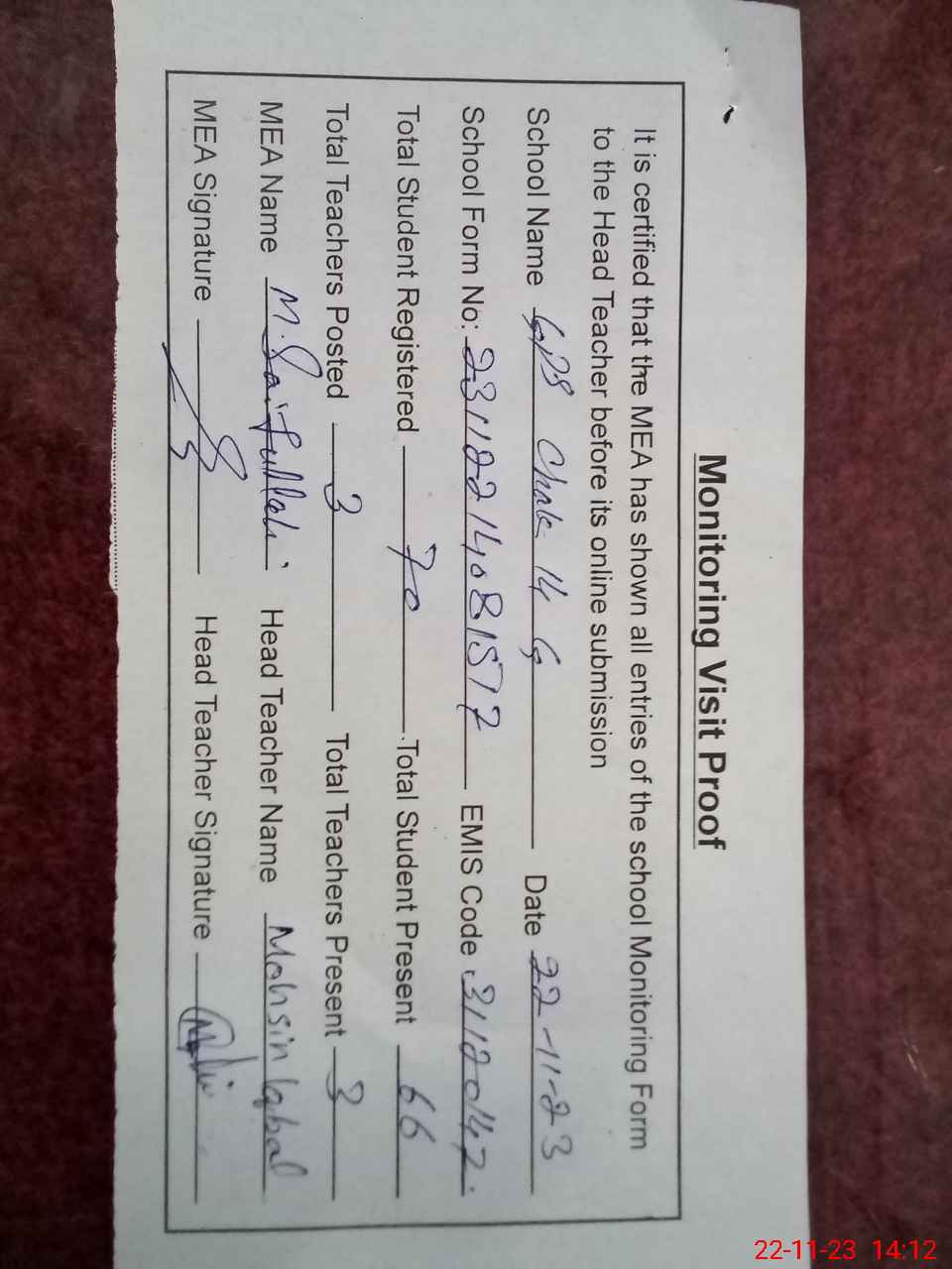 | Attendance Register | Head Teacher | MEA with School | Visit Proof |