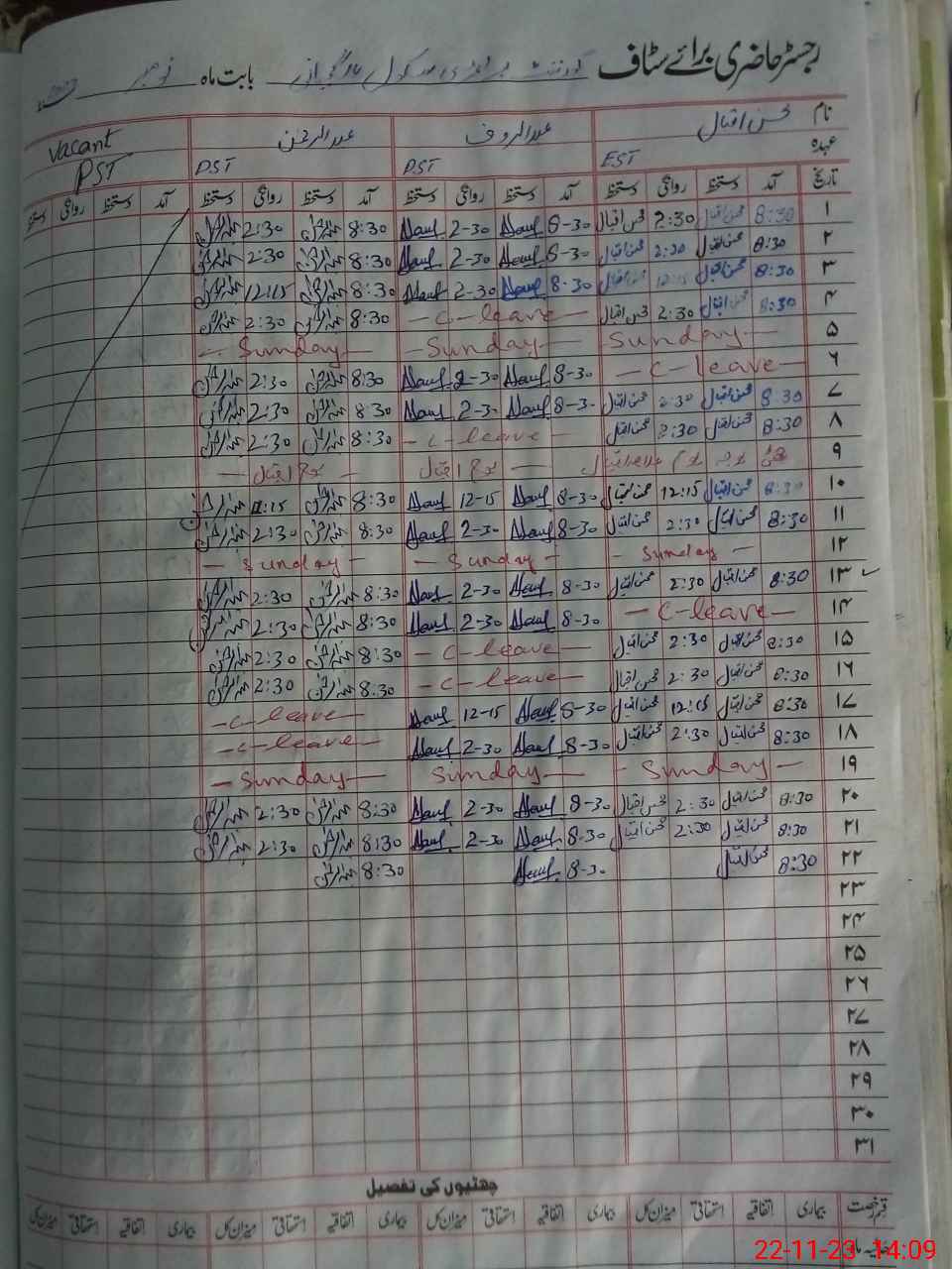 | CNIC | Full Name | Designation | R/C | Absence During Last Calender Month |