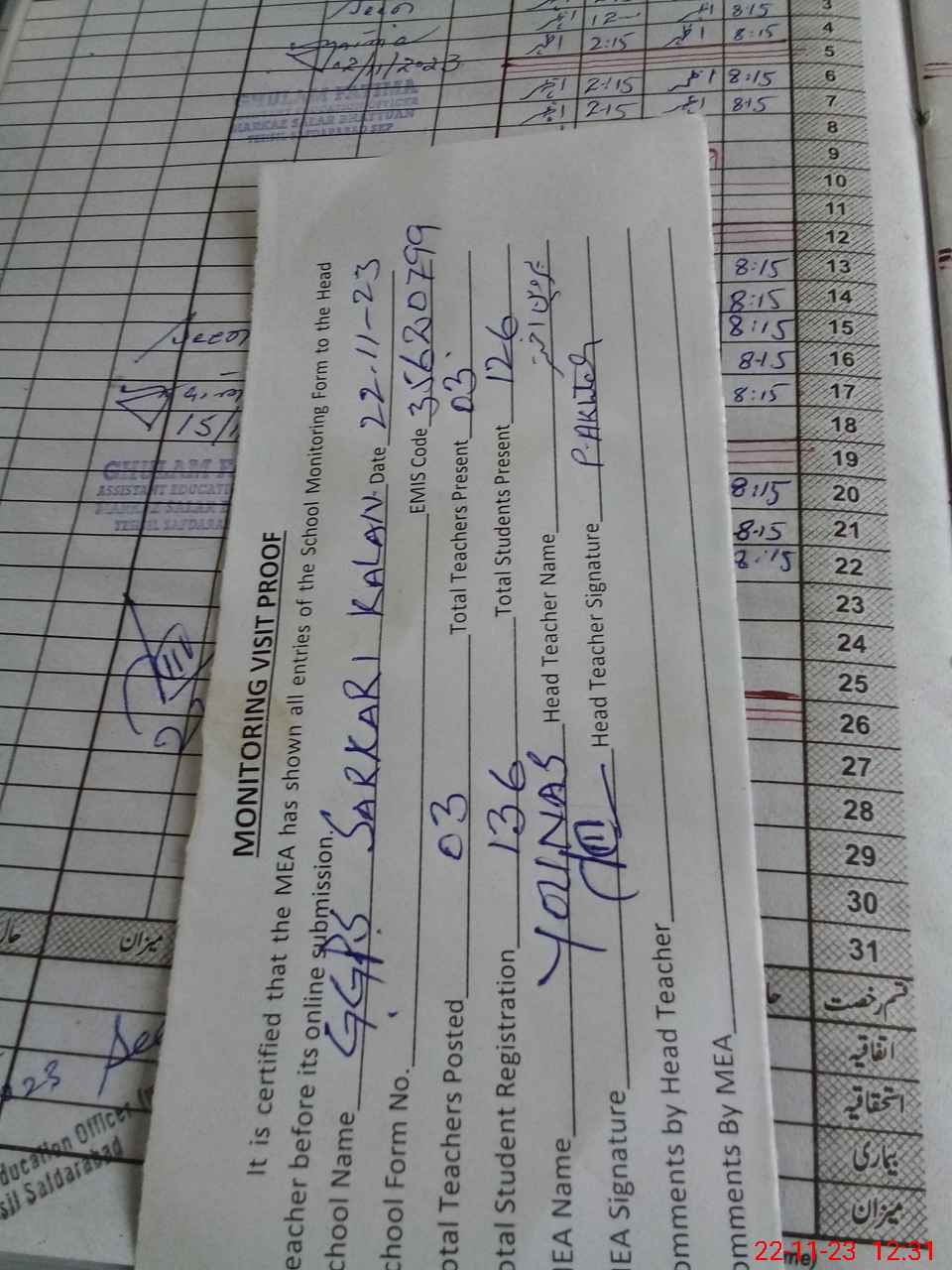 | Attendance Register | Head Teacher | MEA with School | Visit Proof |