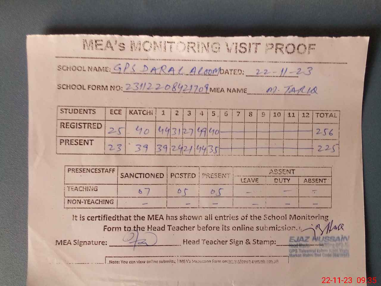 | Attendance Register | Head Teacher | MEA with School | Visit Proof |