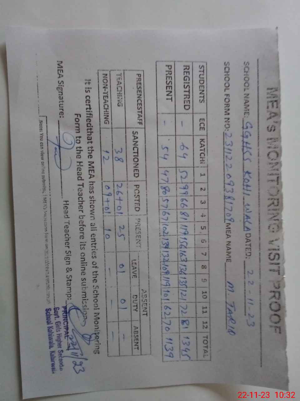 | Attendance Register | Head Teacher | MEA with School | Visit Proof |