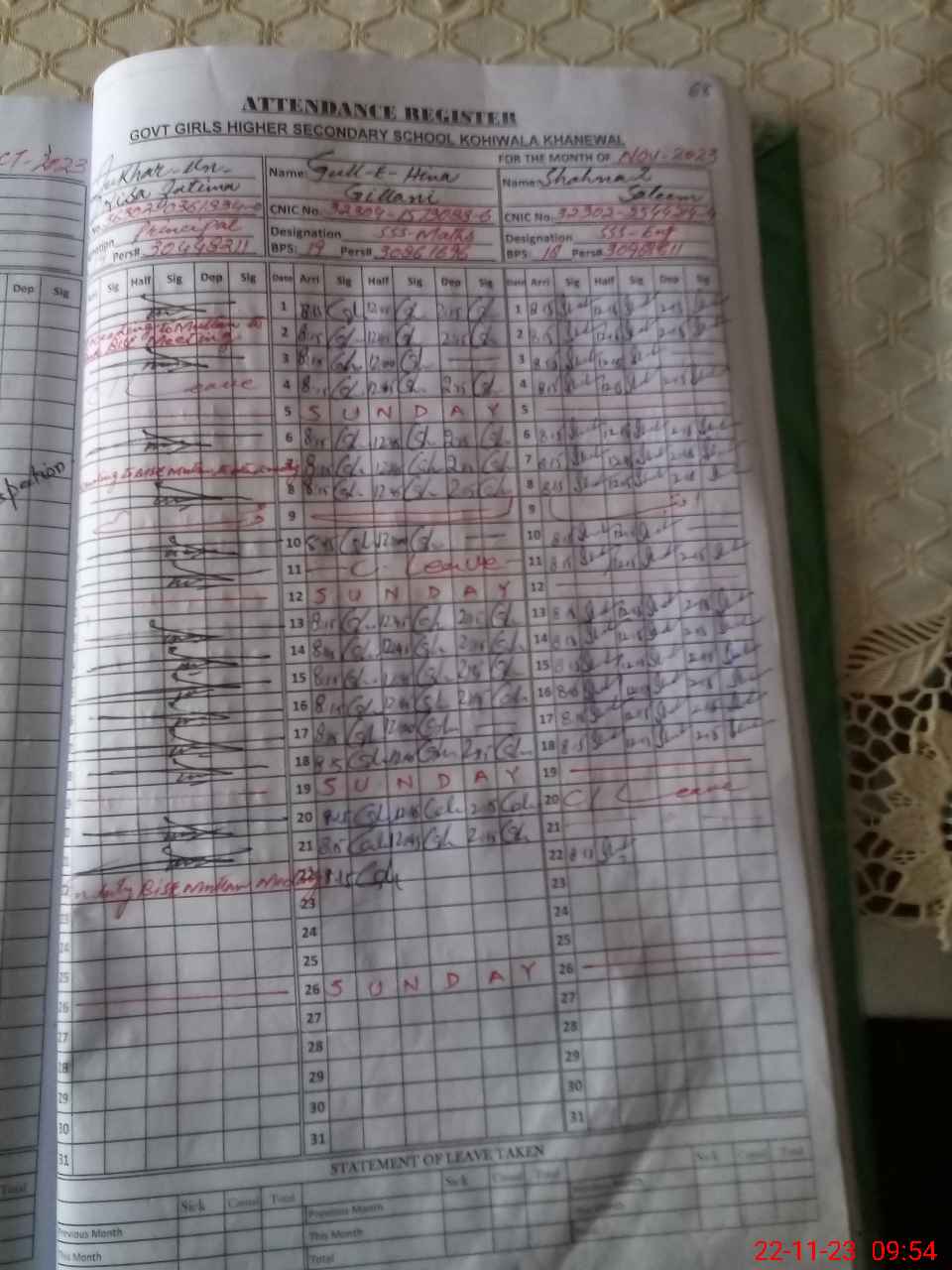| CNIC | Full Name | Designation | R/C | Absence During Last Calender Month |