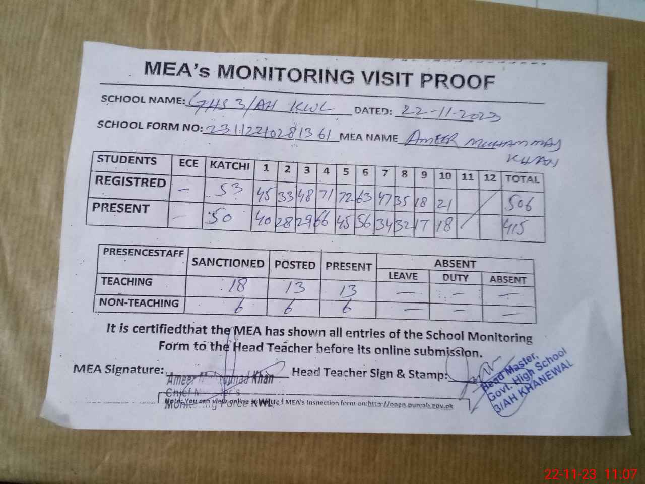 | Attendance Register | Head Teacher | MEA with School | Visit Proof |