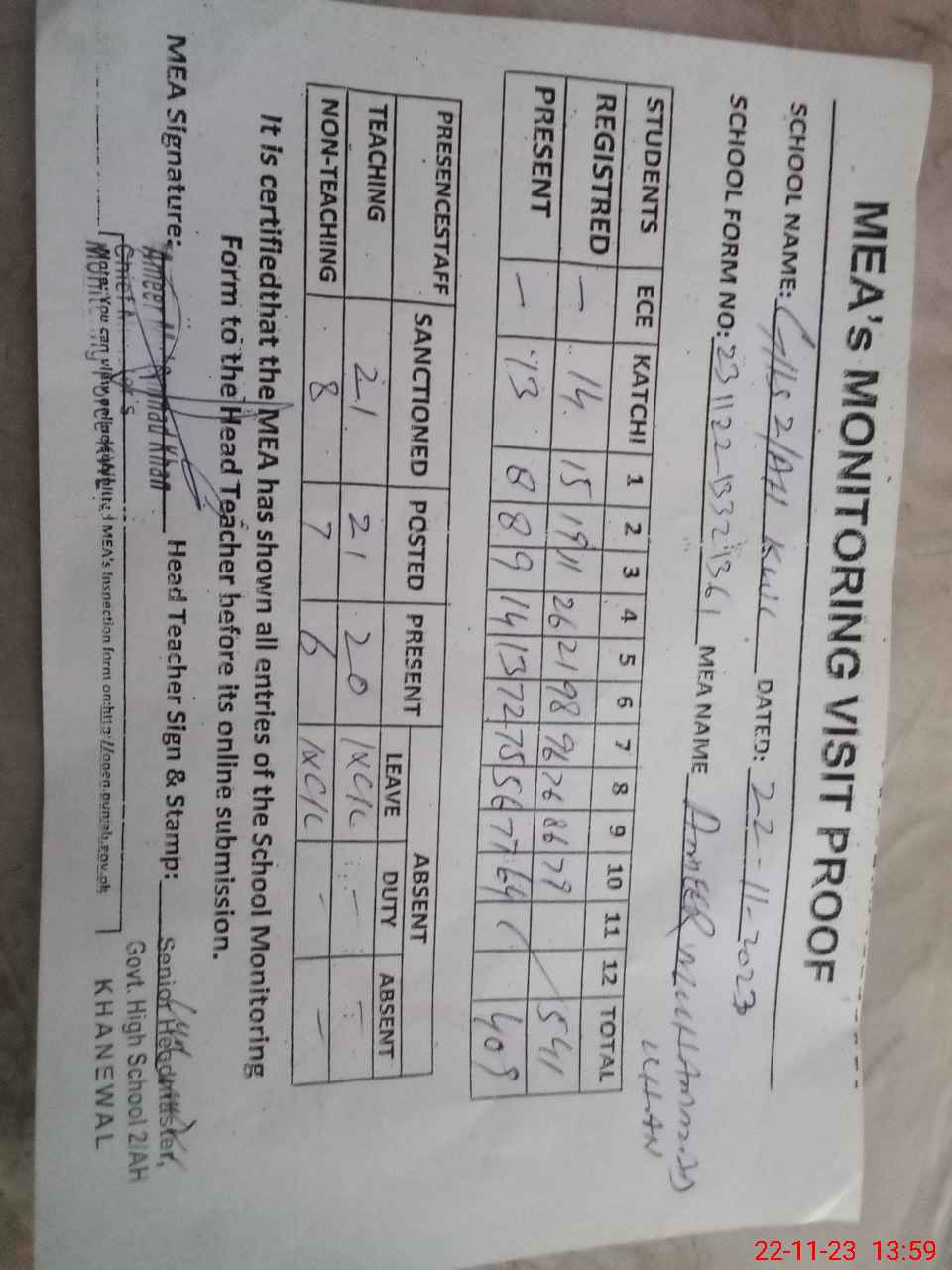 | Attendance Register | Head Teacher | MEA with School | Visit Proof |