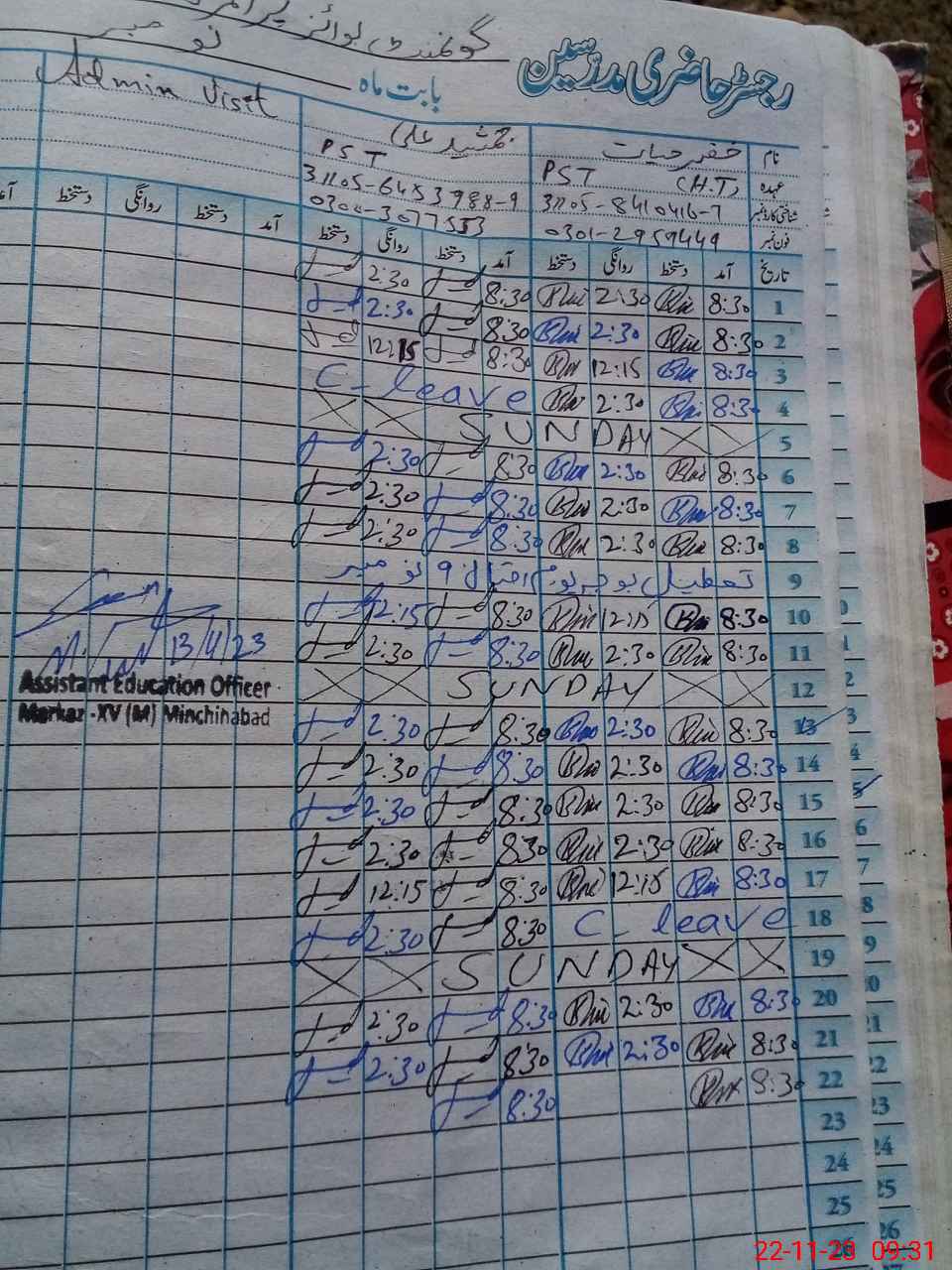 | Name: KH**** HA**** Designation: (School Headmaster's/Headmistress's) PST Phone/Cell Number: 03**** |