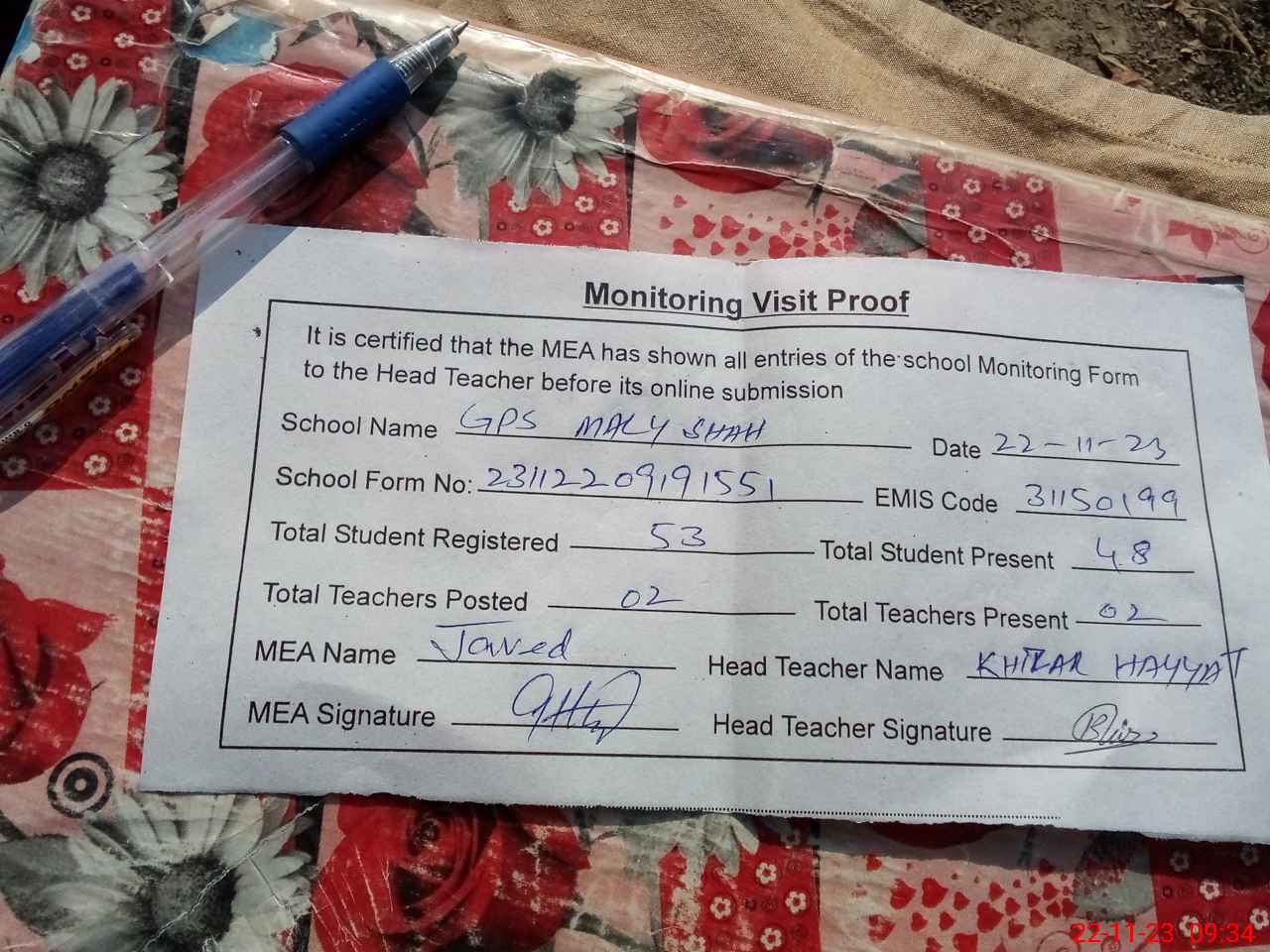| Attendance Register | Head Teacher | MEA with School | Visit Proof |