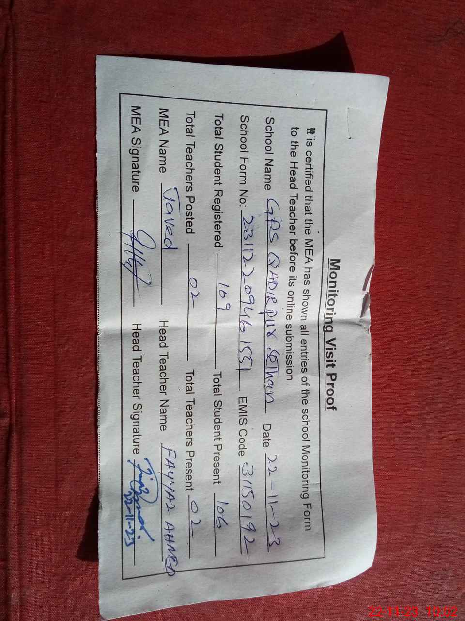 | EMIS Code: 31150192 | Name of School: GPS QADIR PUR SETHAN | |||