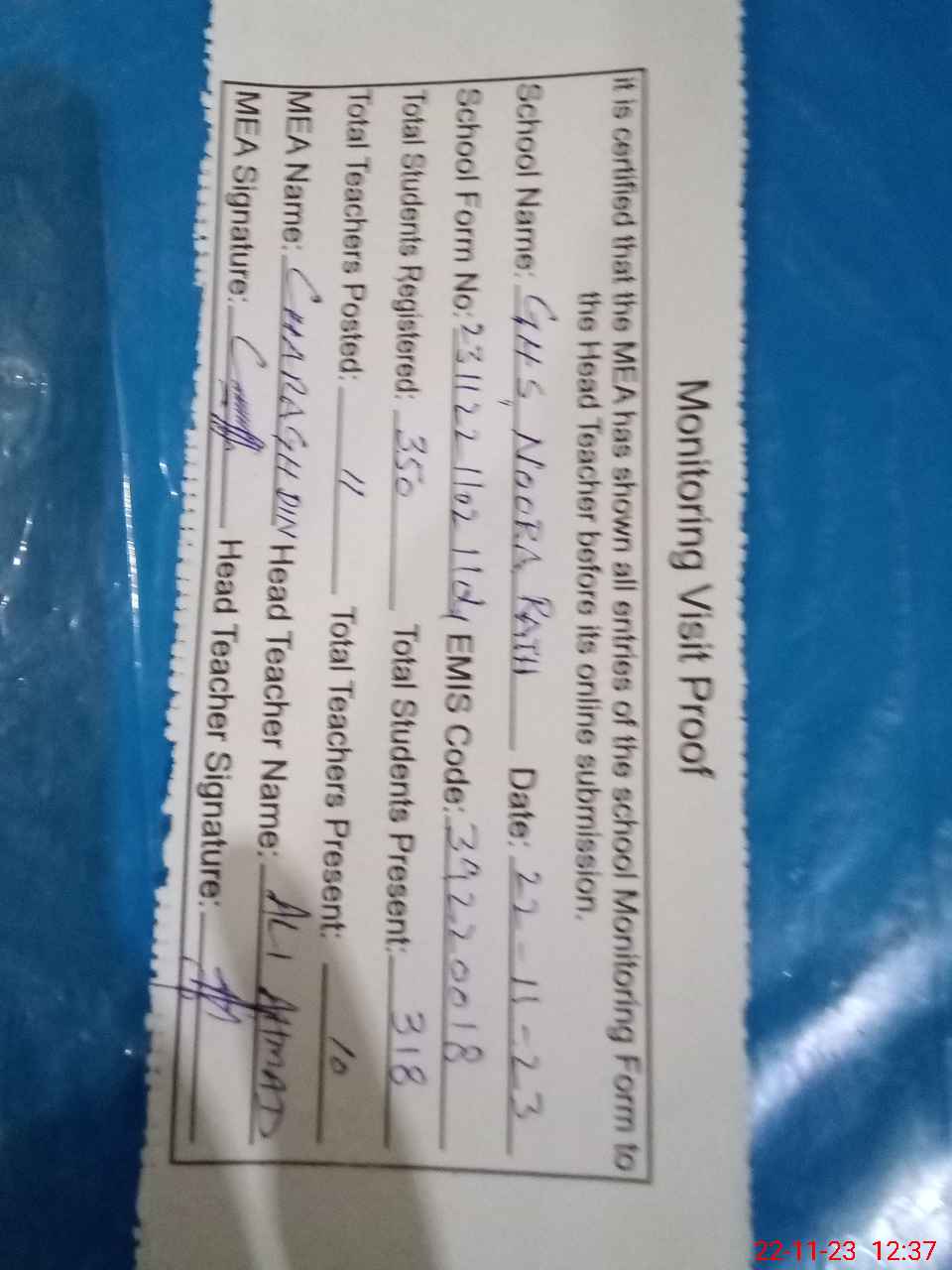 | Attendance Register | Head Teacher | MEA with School | Visit Proof |