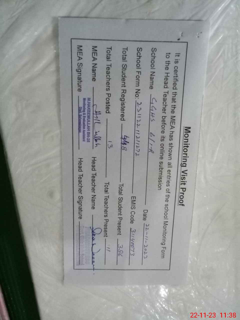 | Attendance Register | Head Teacher | MEA with School | Visit Proof |