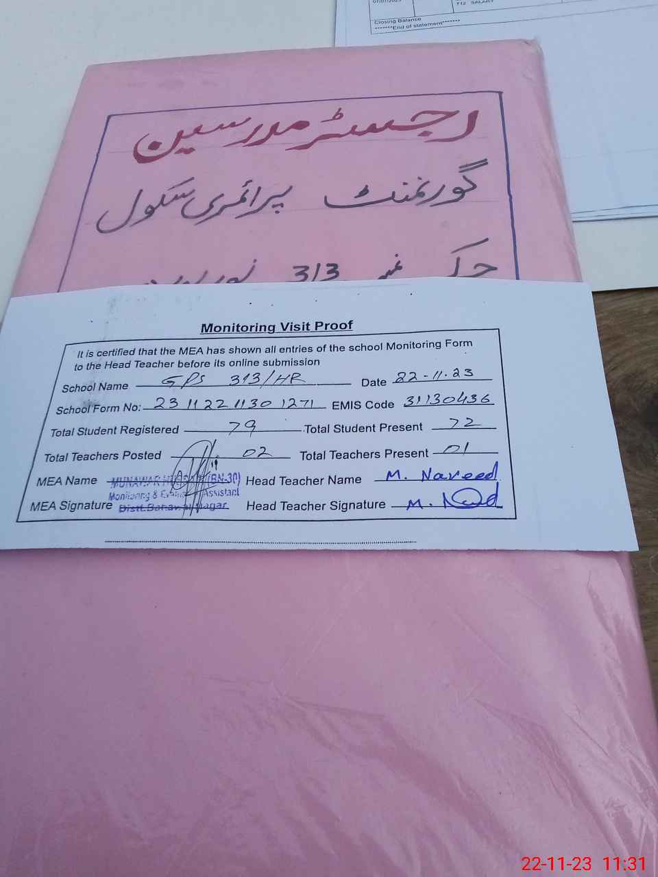 | EMIS Code: 31130436 | Name of School: GPS CHAK NO 313 HR NOOR PUR | |||