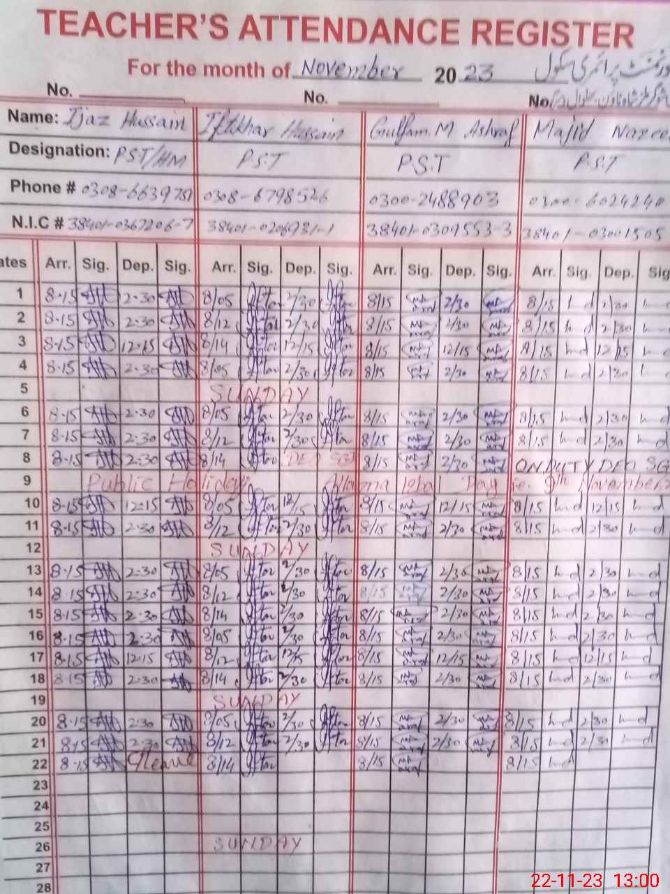 | Name: IJ**** HU**** Designation: (School Headmaster's/Headmistress's) PST Phone/Cell Number: 03**** |