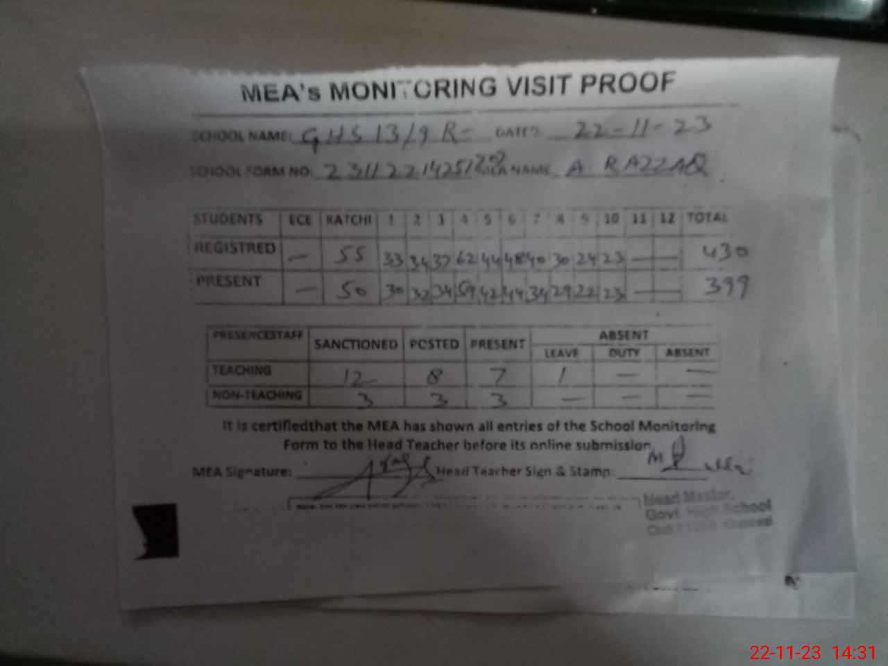| EMIS Code: 36420074 | Name of School: GHS 13/9-R, KACHA KHUH | |||
