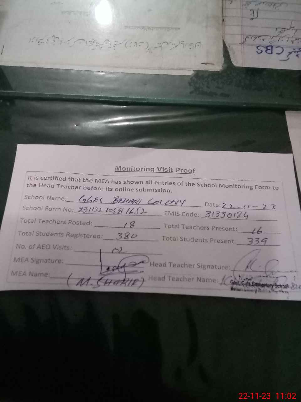 | Attendance Register | Head Teacher | MEA with School | Visit Proof |