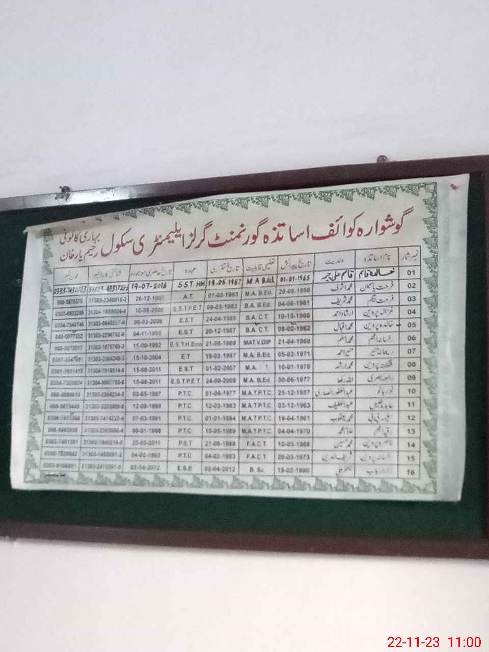 | Name: Uz**** Ra**** Designation: (School Headmaster's/Headmistress's) Head Mistress Phone/Cell Number: 03**** |