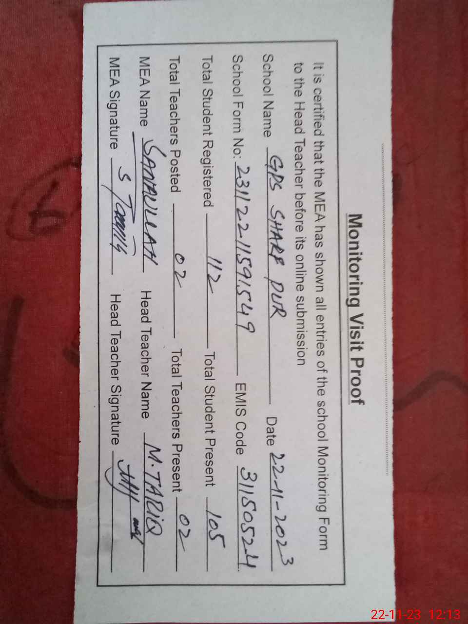 | Attendance Register | Head Teacher | MEA with School | Visit Proof |