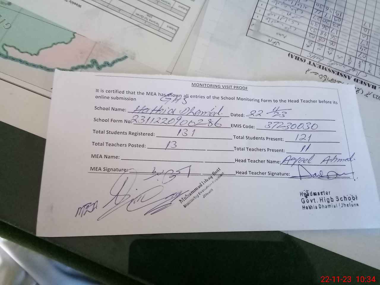 | Attendance Register | Head Teacher | MEA with School | Visit Proof |