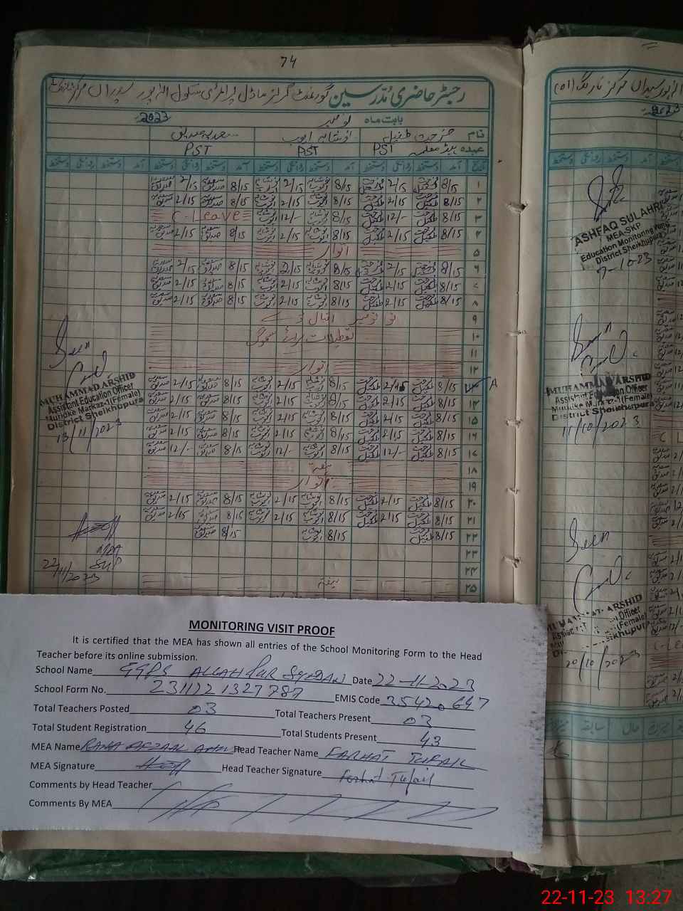 | Attendance Register | Head Teacher | MEA with School | Visit Proof |