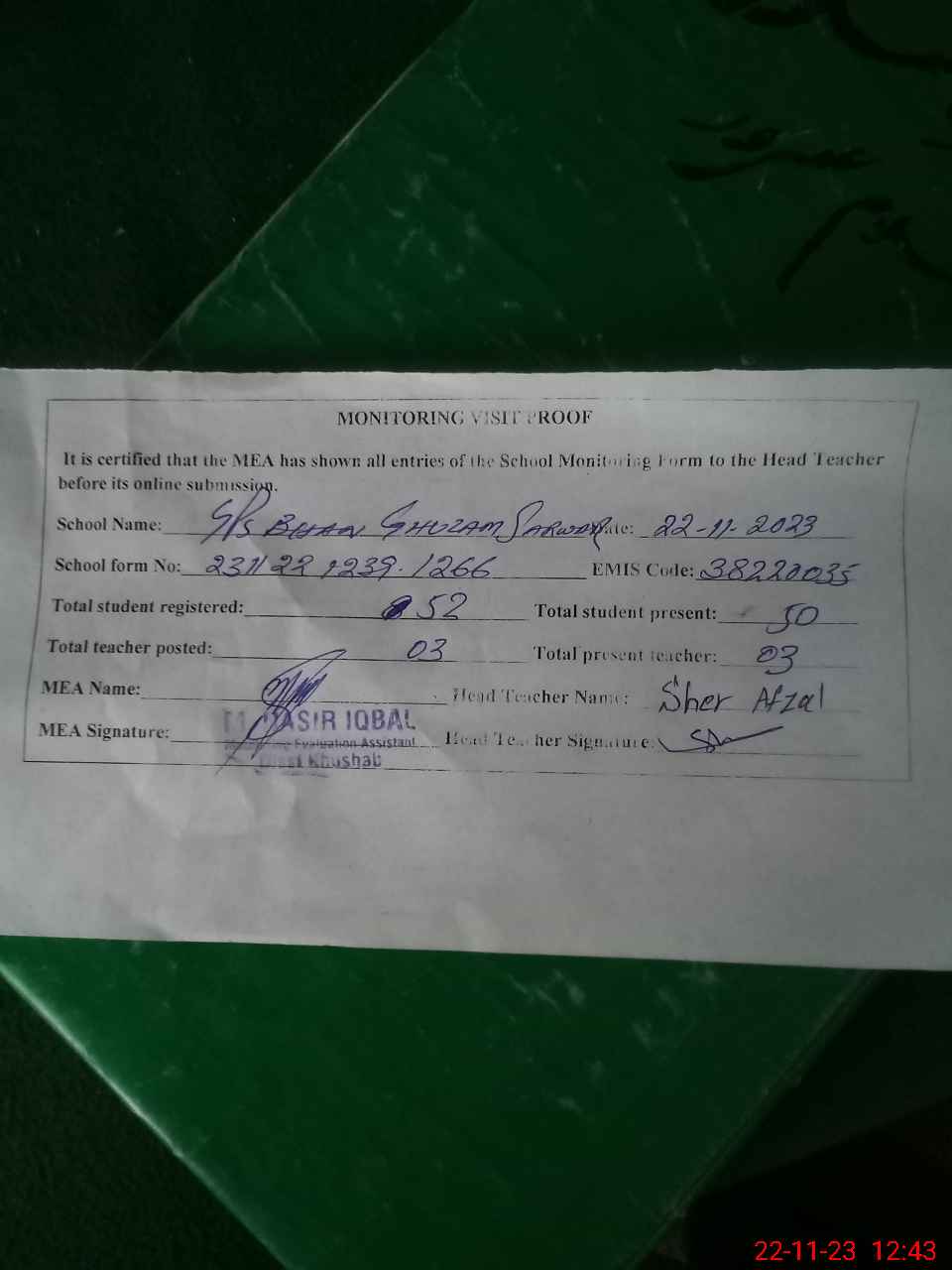 | EMIS Code: 38220035 | Name of School: GPS BHAN GHULAM SARWAR | |||