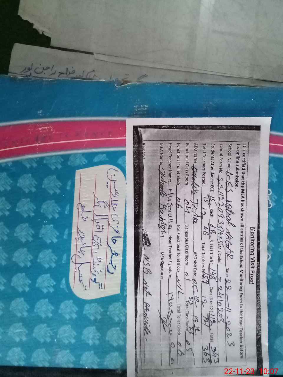 | Certified that this School was Inspected by the Undersigned MEA/DMO Today and the Information Stated Above is as Per Record. | |||||
