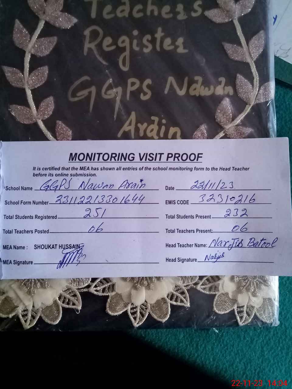 | Attendance Register | Head Teacher | MEA with School | Visit Proof |