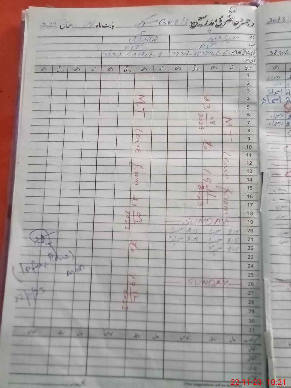 | CNIC | Full Name | Designation | R/C | Absence During Last Calender Month |