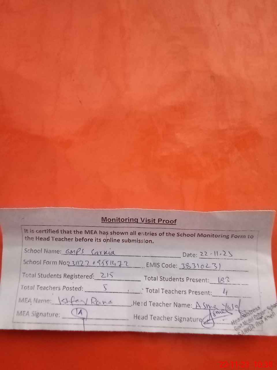 | Attendance Register | Head Teacher | MEA with School | Visit Proof |