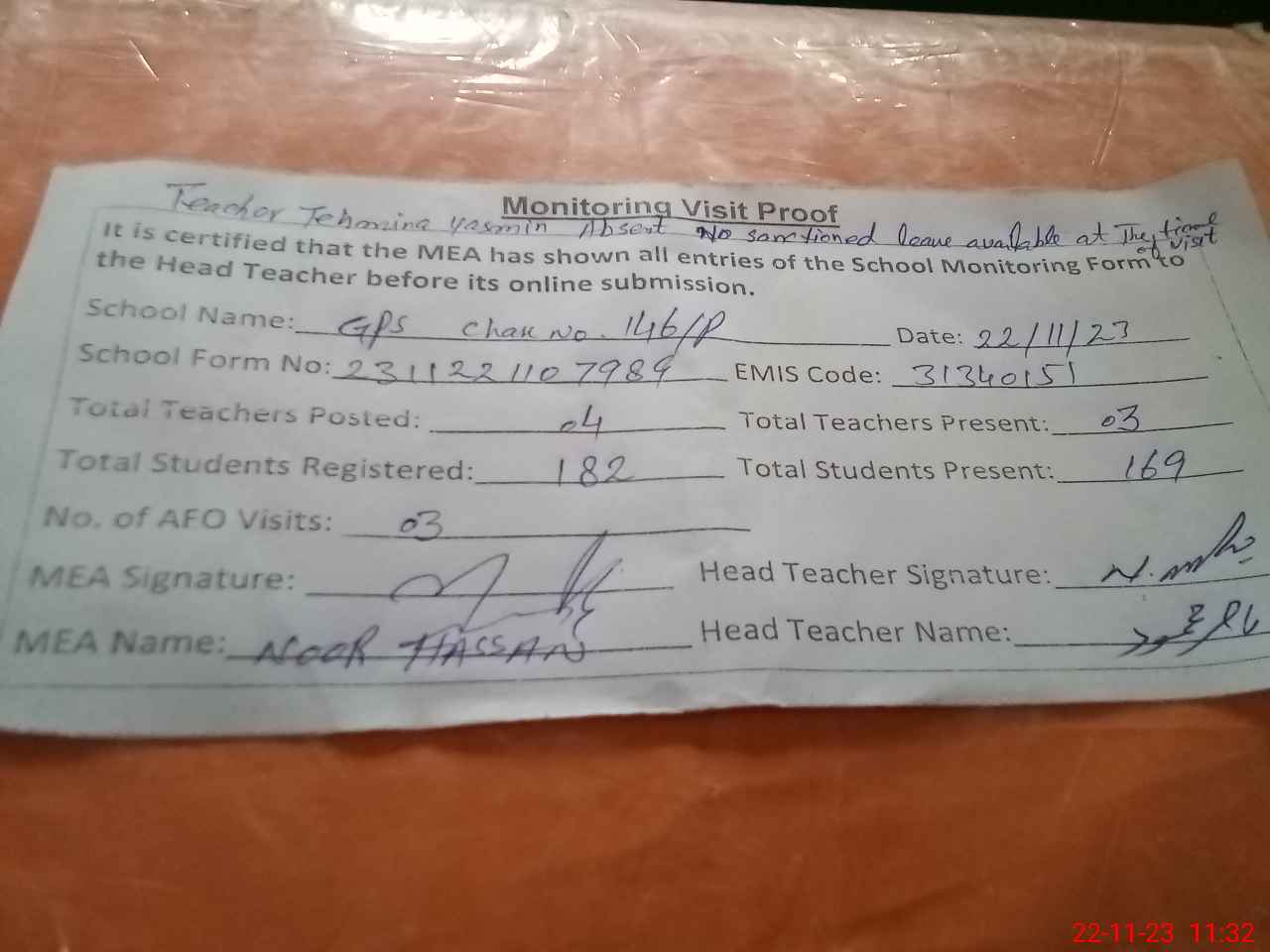 | Attendance Register | Head Teacher | MEA with School | Visit Proof |