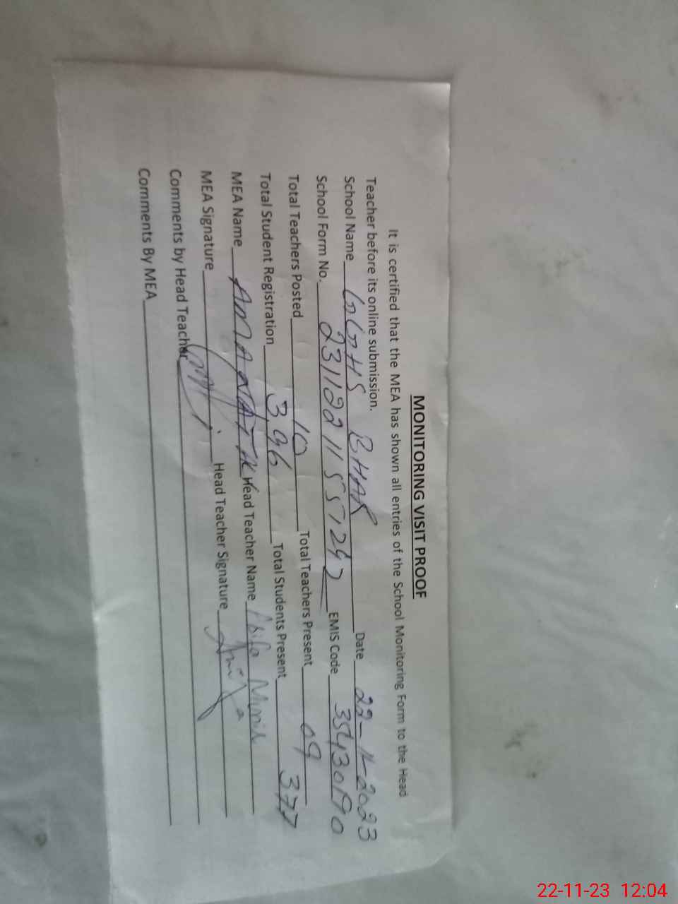 | Attendance Register | Head Teacher | MEA with School | Visit Proof |