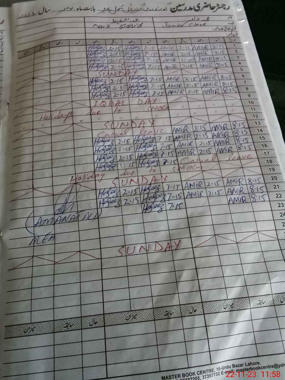 | CNIC | Full Name | Designation | R/C | Absence During Last Calender Month |