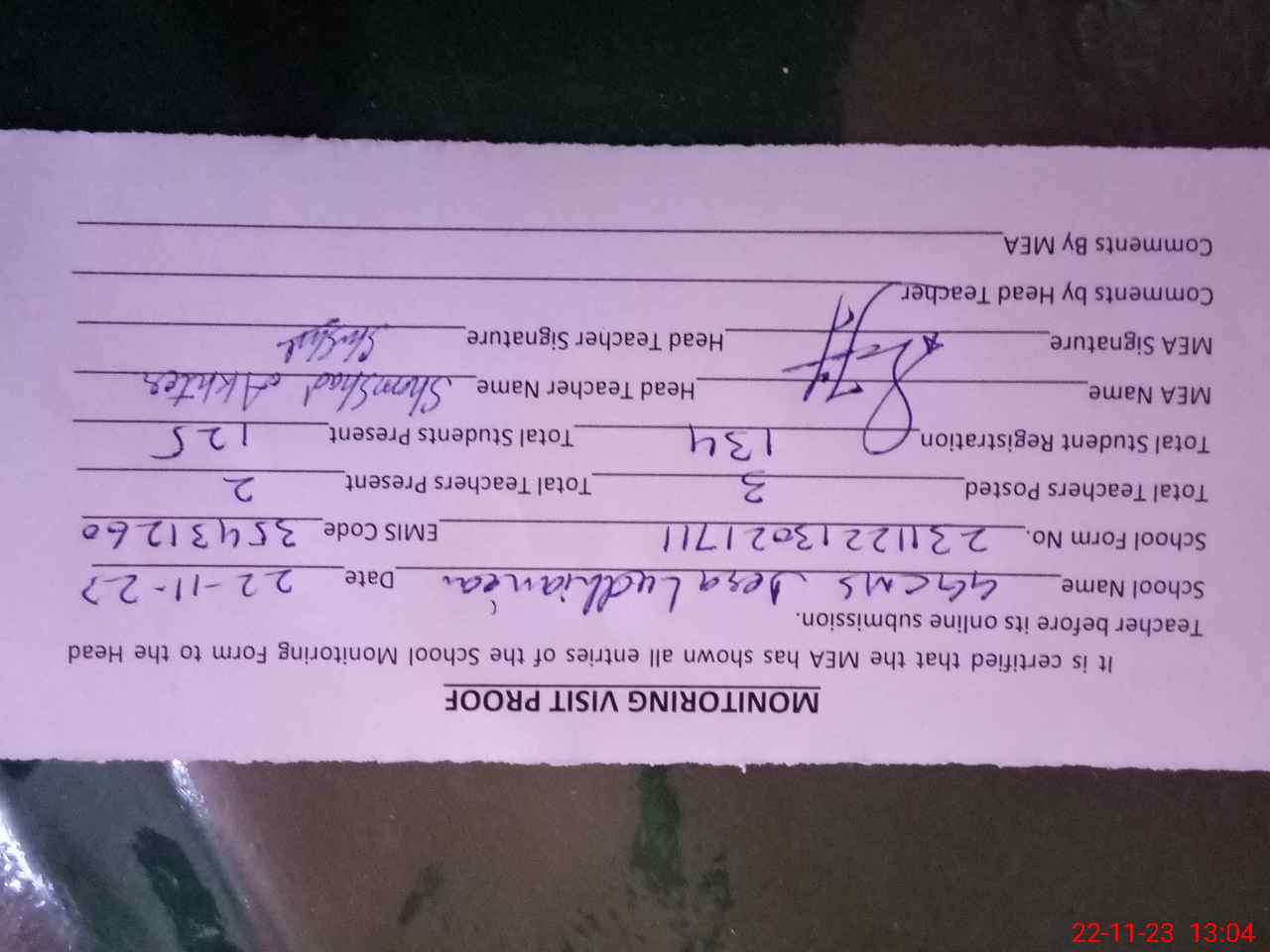 | Attendance Register | Head Teacher | MEA with School | Visit Proof |
