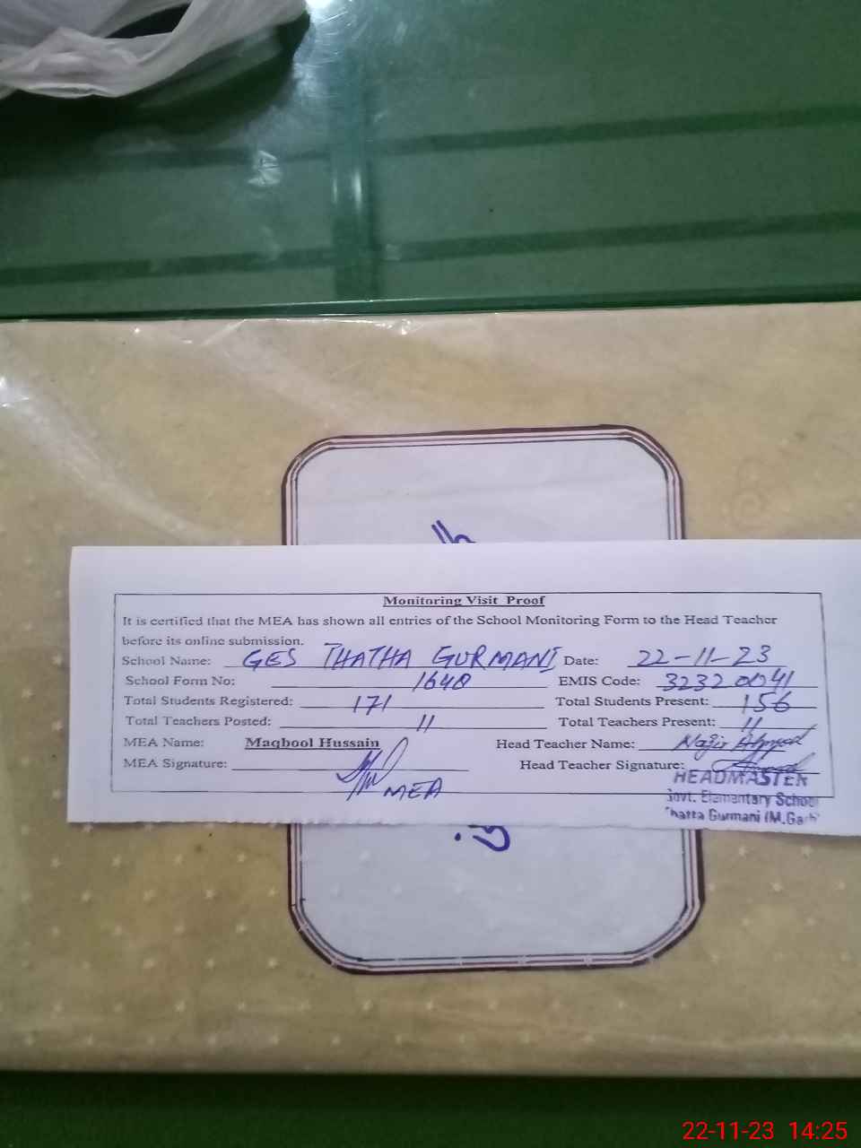 | Attendance Register | Head Teacher | MEA with School | Visit Proof |