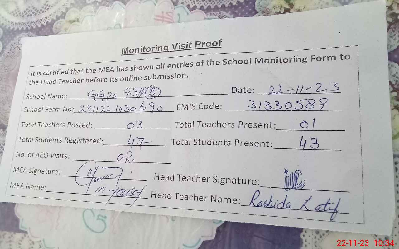 | Attendance Register | Head Teacher | MEA with School | Visit Proof |