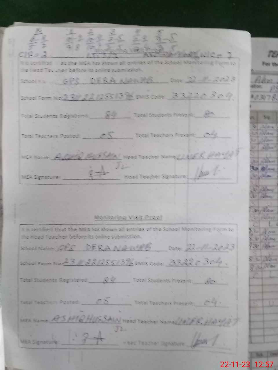 | Attendance Register | Head Teacher | MEA with School | Visit Proof |
