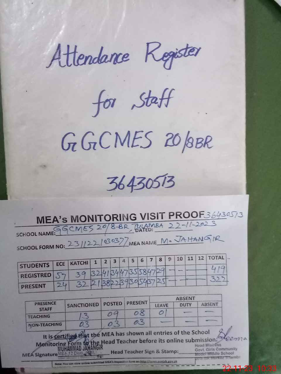 | Attendance Register | Head Teacher | MEA with School | Visit Proof |