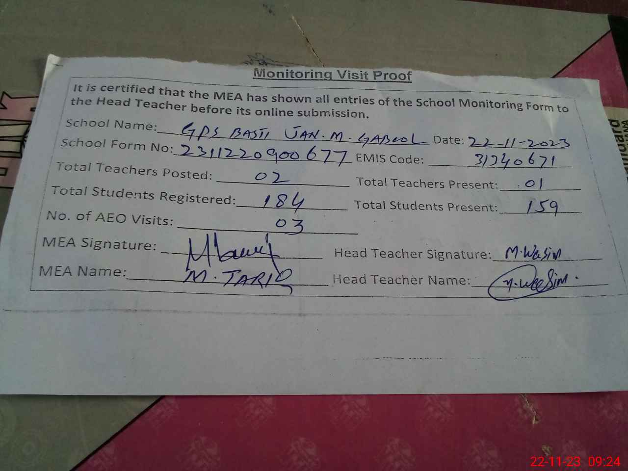 | EMIS Code: 31340671 | Name of School: GPS BASTI JAN MUHAMMAD GABOL | |||