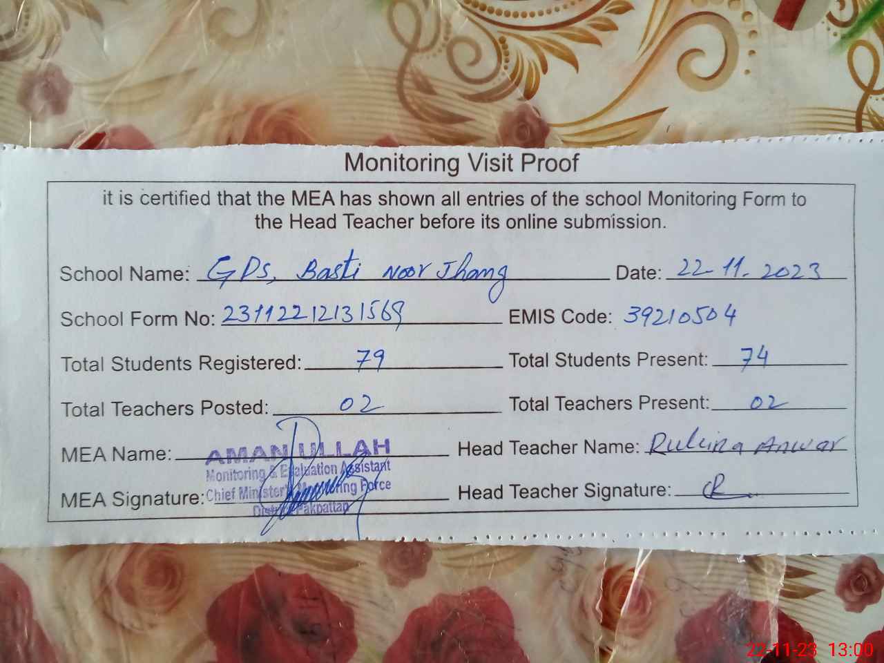 | Attendance Register | Head Teacher | MEA with School | Visit Proof |