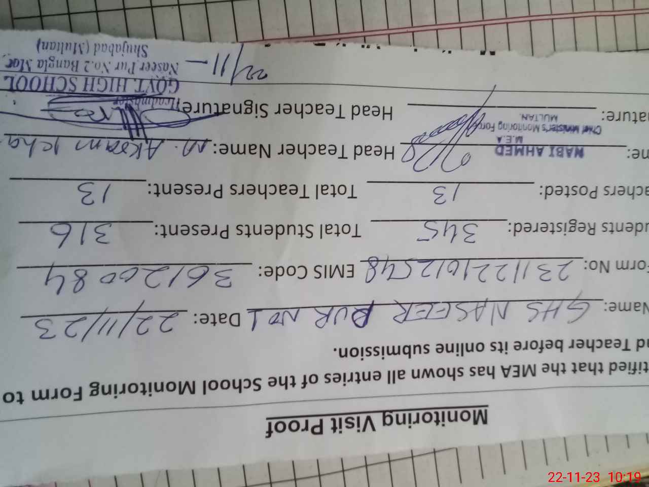 | EMIS Code: 36120084 | Name of School: GHS NASEER PUR NO.2 SHUJABAD | |||