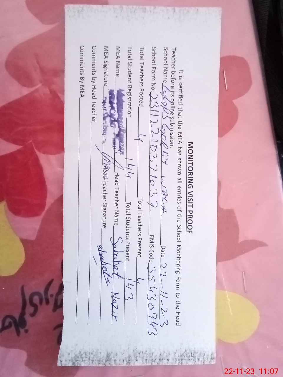 | Attendance Register | Head Teacher | MEA with School | Visit Proof |