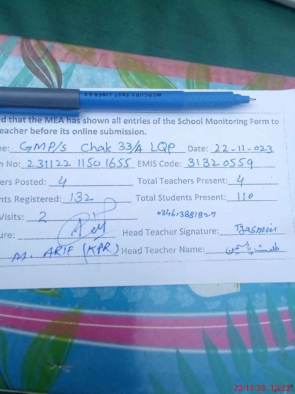 | EMIS Code: 31320559 | Name of School: GMPS CHAK NO. 33/A | |||
