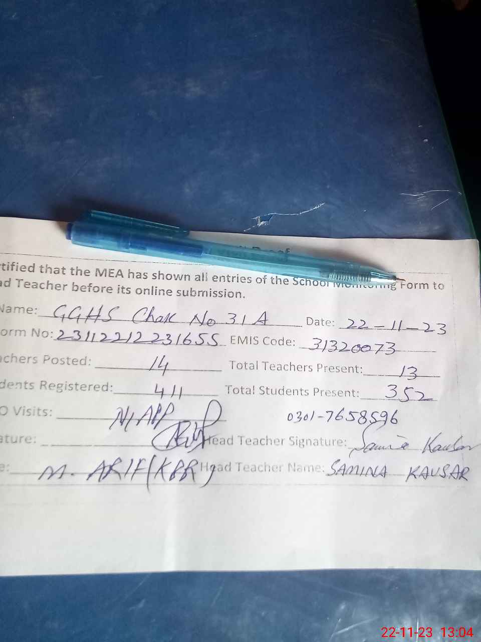 | Name: SA**** KA**** Designation: (School Headmaster's/Headmistress's) SST ( GEN) Phone/Cell Number: 03**** |