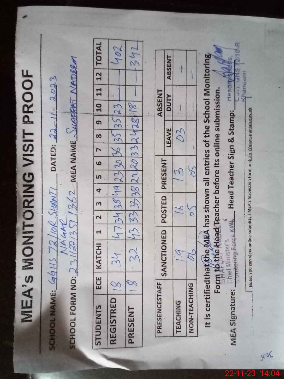 | Attendance Register | Head Teacher | MEA with School | Visit Proof |
