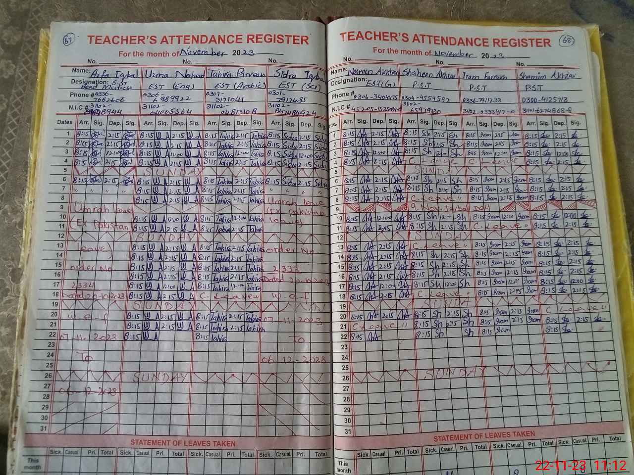 | CNIC | Full Name | Designation | R/C | Absence During Last Calender Month |